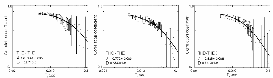 Figure 2. Cross-correlation analysis of the discrete chorus element observed at 13:12 UT on 17 July 2007 onboard THEMIS spacecraft. The correlation coefficient time dependence is shown for spacecraft THC-THD, THC-THE, and THD-THE, respectively. The approximation with function (2) is shown with solid line. The approximation parameters are listed. |