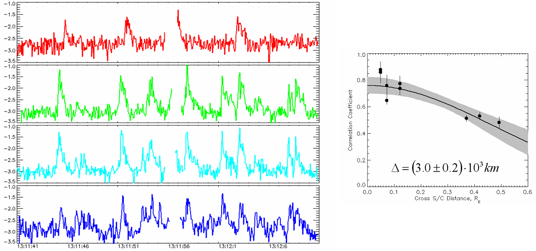 The proposed technique was applied for the magnetic and electric field waveforms captured aboard THEMIS spacecraft (shown in Fig. 1). The temporal dependence of the mutual correlation coefficients is shown in Fig. 2. The solution of the system (2) with structure function values obtained from Eq. (1) by least square approximation resulted in evaluation of the transverse electron concentration correlation scale in a range of 300–450 km and the distance from the spacecraft to the generation region along the magnetic field in a range from 600 to 800 km.