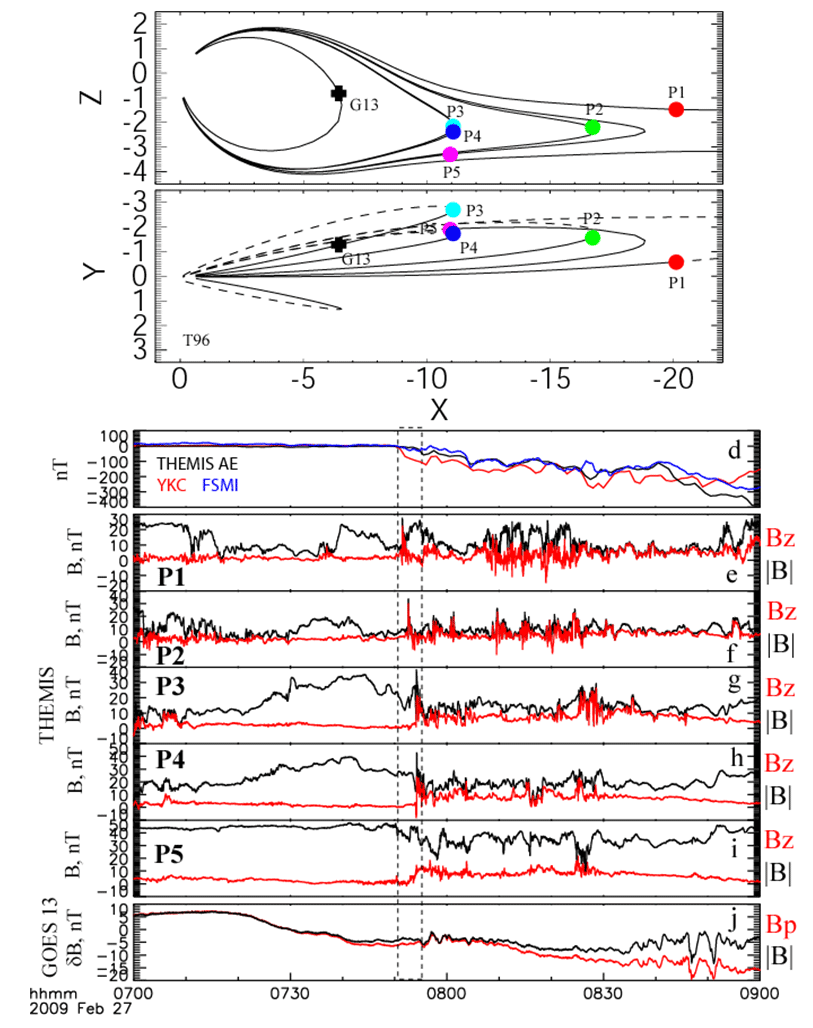 On February 27, 2009, the THEMIS probes were in the major conjunction with P1 at X=-20, P2 at X=-16, and a cluster of P3, P4, and P5 at X=-10 RE (Fig. 1). This configuration allows us to track a magnetic field disturbance (DF, inside dashed box) during its propagation along the magnetotail. Relative timing of DF detections by different probes gives us a front propagation velocity estimate of 300 km/s. Since the DF was not detected by the geostationary spacecraft in conjunction with THEMIS probes, it likely was stopped or deflected somewhere in between -11 and -7 RE. Ground-based magnetometer detected onset of a negative variation in the magnetic field X component roughly simultaneously with the DF detection in space. All-ski imagers at around footprints of the THEMIS probes observed a north-south arc appeared in a minute later than the DF was detected by P1.