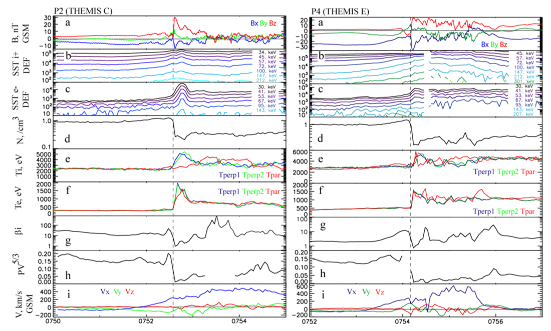 Figure 2 shows detailed observations of magnetic field and plasma parameters, including the flux-tube entropy function, observed by P2 and P4 at X=-16 and -10 RE, respectively. The observations indicate that the probes observed the same entropy-depleted flux tube, propagating earthward. These objects are known as "plasma bubbles."