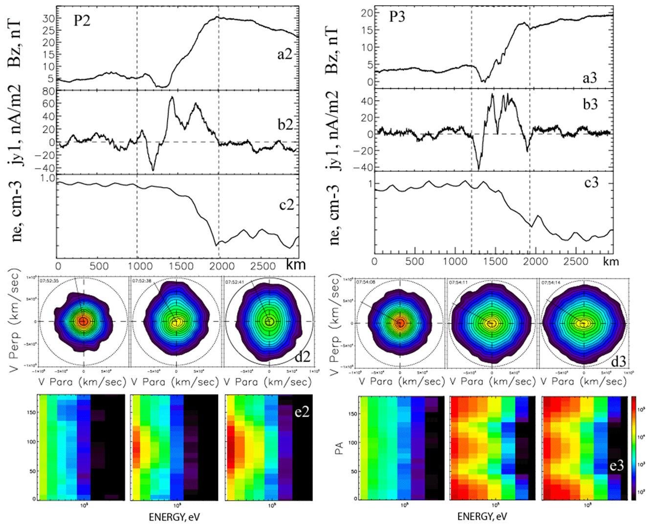 The multi-point observations allowed us to convert time delays into spatial distances assuming the DF propagation at a constant velocity. Thus, spatial profiles of magnetic field and its gradient may be reconstructed from the time series. Moreover, measurements of the spacecraft potential gave us an estimate of electron density with the time resolution enough to resolve kinetic structure of the DF. Figure 3 shows the reconstructed profiles and electron distribution functions, obtained ahead of the DF, on it, and behind it. The DF thickness was found to be of 500 km, which is comparable with an ion thermal gyroradius. Thus, the DF is a thin layer of enhanced current density: a vertical thin current sheet. Electron populations ahead and behind the front have different properties: electrons behind the front are more energetic. Interestingly, pitch-angle distributions of energetic electrons are different at X=-16 RE and at X=-10 RE.