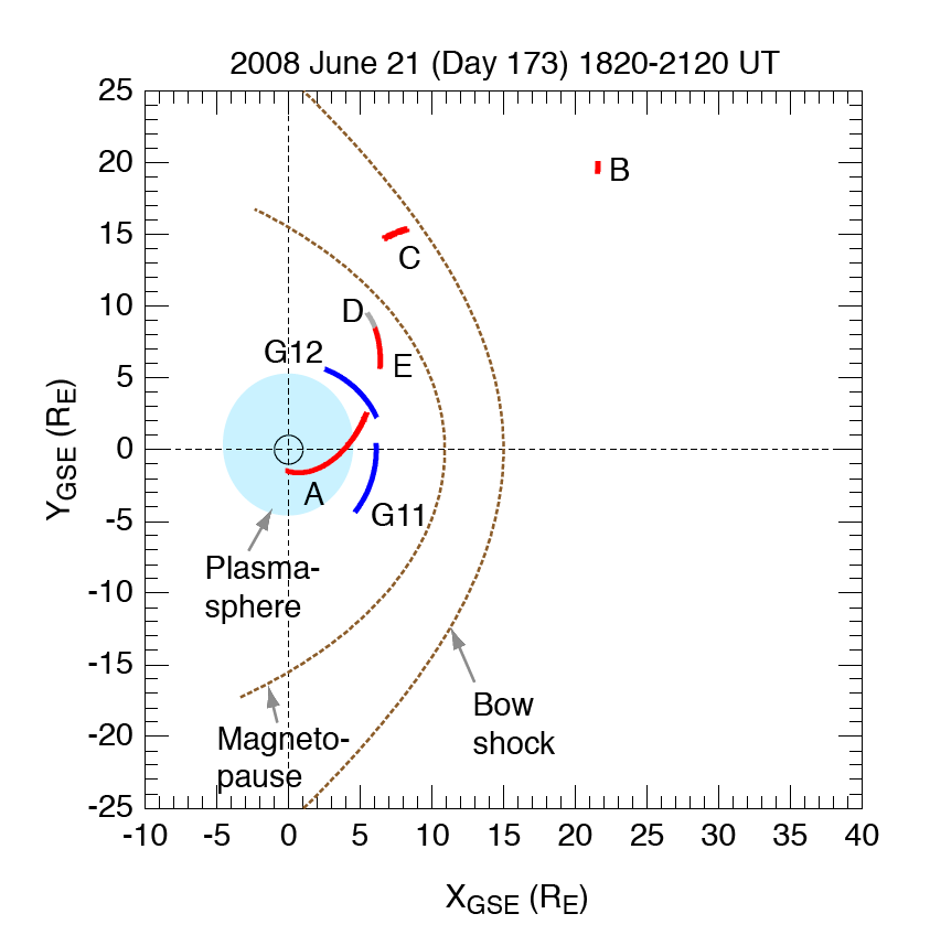 Figure 1. The location of satellites for 1810-2110 UT on June 21, 2008, projected on the equatorial plane of the geocentric solar ecliptic coordinates. The spacecraft are THEMIS probes, abbreviated A through E, and the GOES-11 (G11) and -12 (G12) geostationary satellites. The region shaded in blue is a schematic plasmasphere.