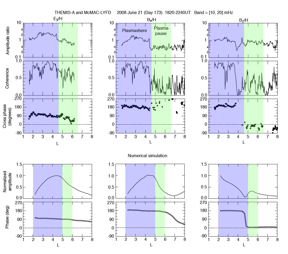 Figure 3. (upper 3 rows) The radial structure of the 10-20 mHz oscillations observed by THEMIS-A, referenced to the H-component oscillations at the Lyford ground station (L = 1.5, longitudinally close to THEMIS-A). Different shadings are use to indicate the plasmasphere (L = 1.0-4.7) and the plasmapause transition region (L = 4.7-6.6). From top to bottom: the satellite to ground amplitude ratio; the coherence; the cross phase. (lower 2 rows) The amplitude and phase of the same three field components for trapped MHD waves obtained in a numerical simulation.