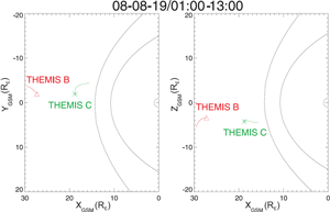 Figure 1 shows the trajectory of the THEMIS spacecraft from 0100 to 1300 UT on 19 August 2008. THEMIS B and C were upstream from the bow shock. A red triangle and a green asterisk mark the positions of B (red) and C (green). The positions of probes are 14 RE and 5 RE upstream from the bow shock at 1300 UT.
