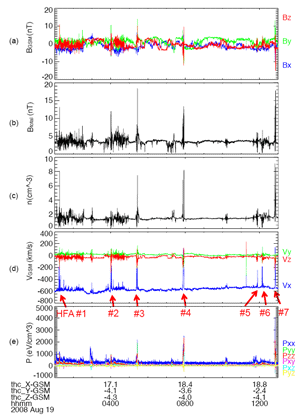 THEMIS C observed a series of seven HFAs from 0100 to 1300 UT on 19 August 2008. Figure 2 shows an overview plot of these seven HFAs. Clear flow deflections mark the seven HFAs identified by arrows in Figure 2d. As can be seen from Figure 1, THEMIS B was further upstream from the bow shock than THEMIS C. Although THEMIS B did not observe any significant deflections in the solar wind flow during this interval, it did observe 4 proto-HFAs which are characterized by density and magnetic field strength depletions and electron heating. These proto-HFAs developed into HFAs 2, 4, 5, and 6 which were observed by THEMIS C downstream.