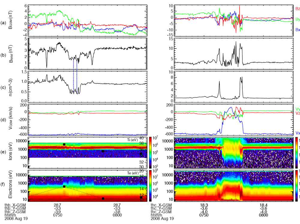 Figure 3 shows HFA 4 observed by THEMIS C (right) and the corresponding proto-HFA observed by THEMIS B (left). The magnetic fields recorded by THEMIS B and C are very similar (with 110 s time shift) except during the event time interval (Figure 3a). The proto-HFA observed by THEMIS B is characterized by decreases (~50%) in the magnetic field strength and plasma density (Figure 3b and 3c), moderate ion and electron heating (Figures 3e and 3f), and turbulent but not deflected solar wind flow (Figure 3d). After 110s, this proto-HFA developed into a mature HFA observed by THEMIS C. It has a very hot core (~107K) bounded by regions of strongly enhanced magnetic field strength and density. The magnetic fields were very turbulent inside the hot core but without much depletion in the field strength and plasma density (Figures 3b and 3c). The solar wind flow was significantly deflected (Figure 3d).