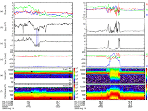 Figure 1. THEMIS trajectory projected in GSM THEMIS trajectory projected in GSM (left) X-Y plane and (right) X-Z plane from 0100 to 1300 UT on 19 August 2008. The positions of THEMIS B and C probes at 1300 UT are marked by a red triangle and green asterisk, respectively. During this 12 h time interval, both THEMIS B and C were upstream of the bow shock. |