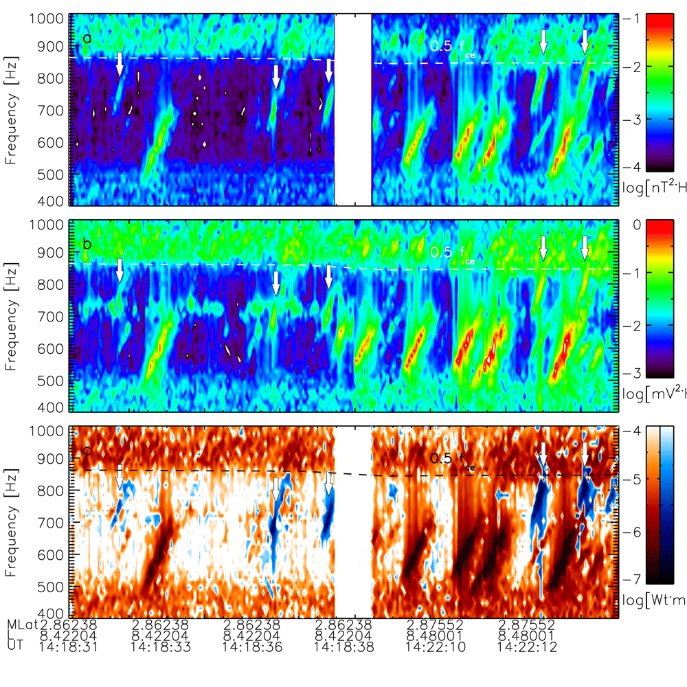 Figure 1. Detailed time-frequency power spectrograms of magnetic (top) and electric (middle) field fluctuations near the source region recorded by the SCM (a) and EFI (b) instruments aboard THA on 26 July 2008. Frequency-time dependence of the Poynting vector direction of forward and reflected chorus observed by the SCM/SCW (c) The field aligned waves elements are marked with red color and the elements propagated in opposite direction are marked with blue color. Spectral power is in logarithmic scale. The reflected chorus elements are marked with white arrows.