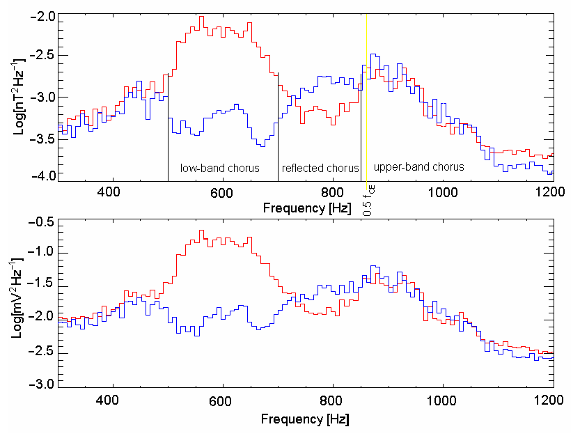 Figure 1 presents detailed time-frequency diagrams of magnetic field and electric field perturbations and the Poynting flux vector recorded aboard THA on 26 July 2008 when it was close to local magnetic noon and to the geomagnetic equator plane, RSM = [8.4, 0.15, 0.42], MLat = 2.8° - 2.9°, Kp=0, Dst= -8 nT. The local electron gyrofrequency is fce = 1750 Hz. Discrete chorus emissions are clearly seen in the two frequency diapasons (0.15 - 0.45 fce and 0.5 - 0.6 fce) typical for chorus waves generated in the vicinity of the magnetic equator. The projection of the Poynting vector on the local magnetic field is shown in the lower panel of Fig.1. The Poynting flux direction along the local magnetic field (poleward) is marked with red color gamma and the opposite direction (equatorward) is marked with blue. High-amplitude discrete chorus elements are followed by lower amplitude elements with a frequency range from 0.2 fce to 0.5 fce and different frequency rise speed. These elements can be clearly seen in the Poynting vector flux panel as elements with the Poynting vector directed equatorward.