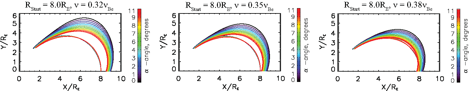 Figure 3. Whistler ray trajectories for three different wave frequencies. The angle between the magnetic field and whistler's k-vector is varied in the range 0°-11°. Rays propagate in the meridional plane.