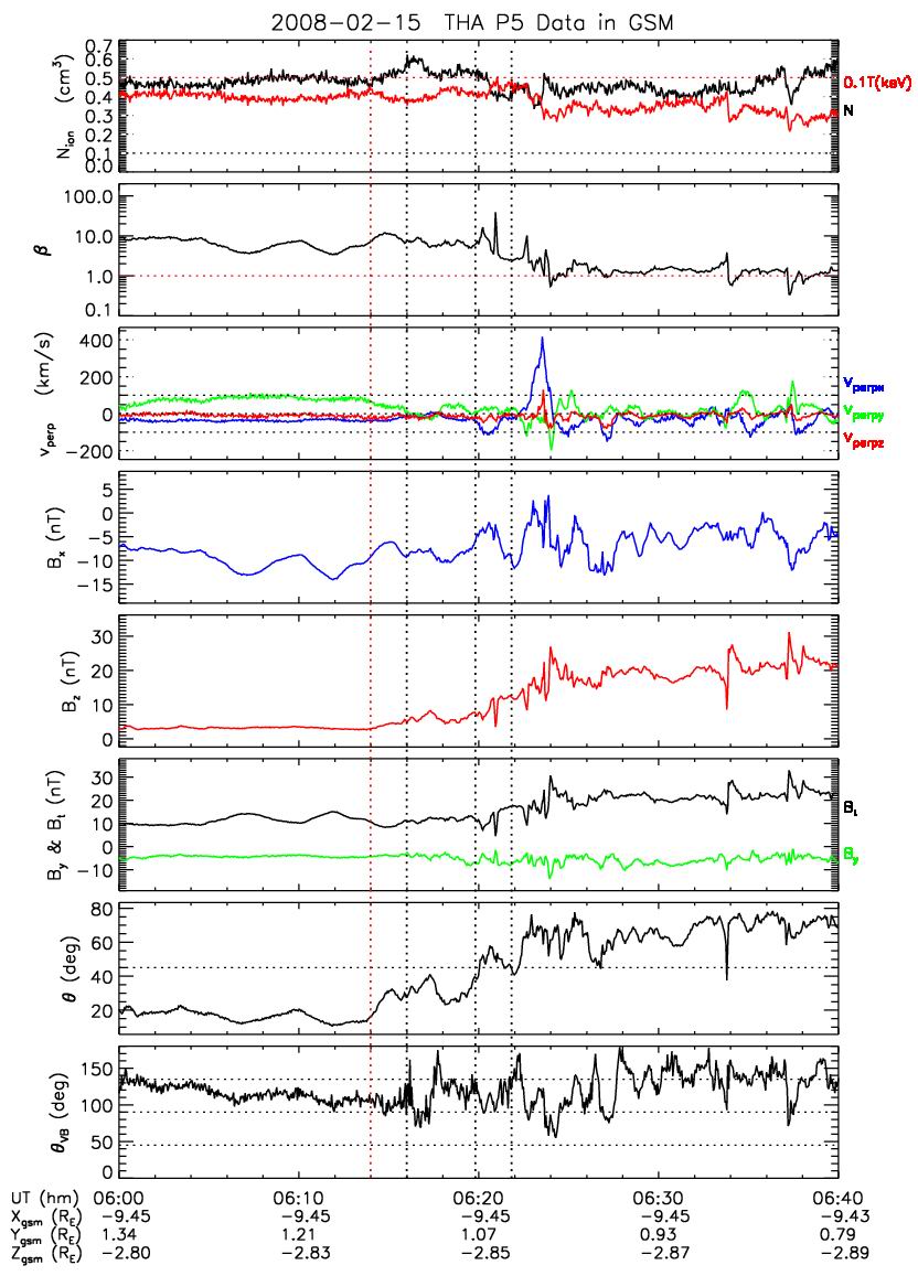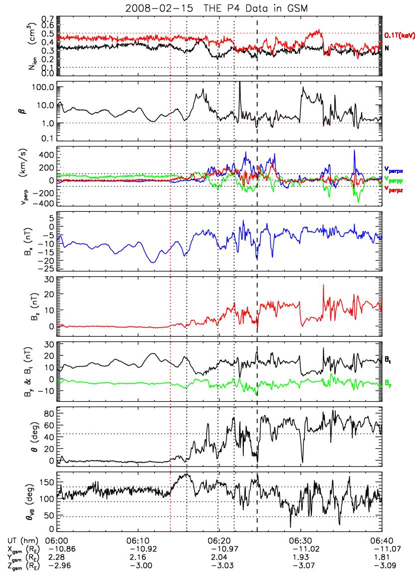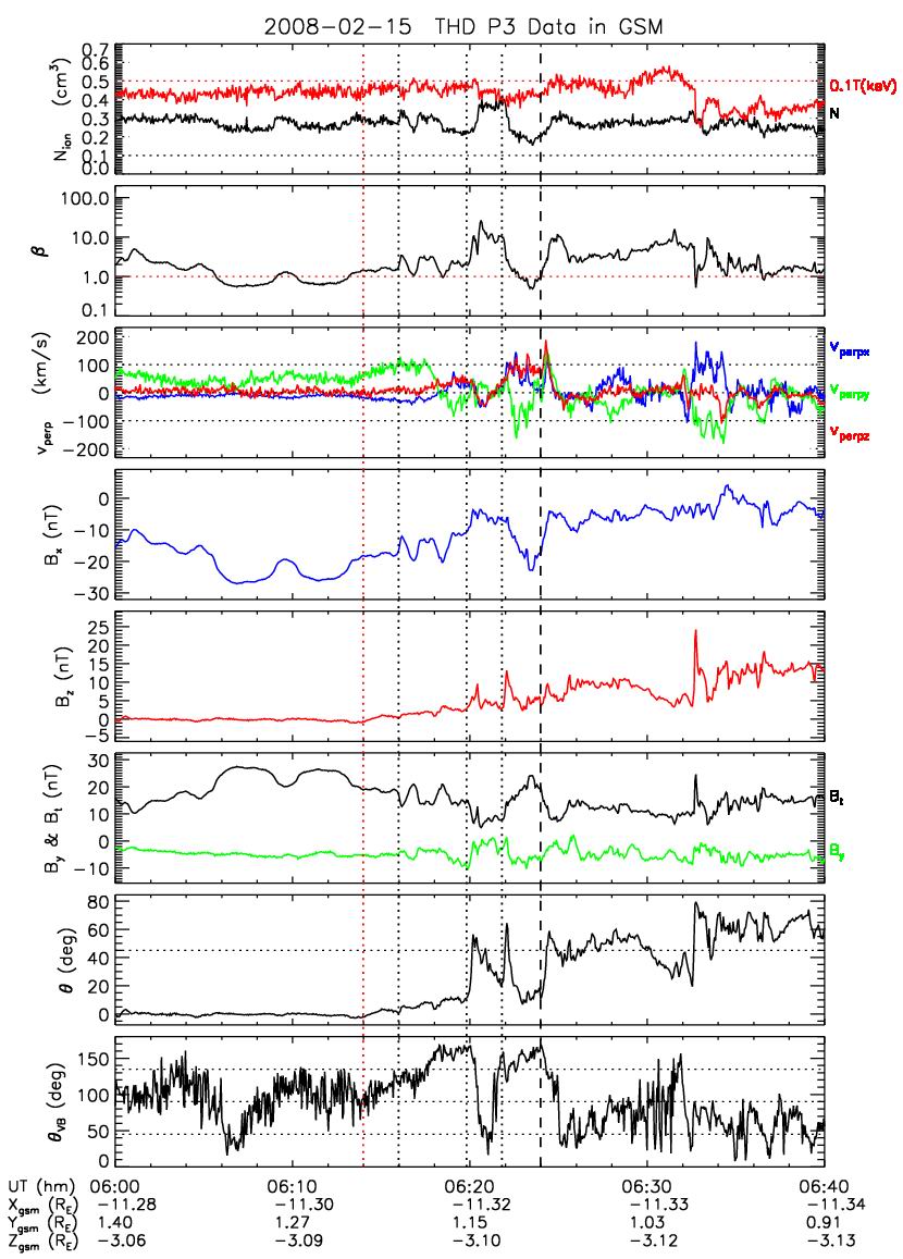 Figure 1. THEMIS multiple probes observed the dipolarizations during the substorm occurring at 06:14 UT on 15 February 2008 in the near-Earth plasma sheet. Figure 1(a), 1(b) and 1(c) are from THA, THE and THD, respectively. The red vertical dotted line marked the substorm onset time, i.e., the first magnetic dipolarization.