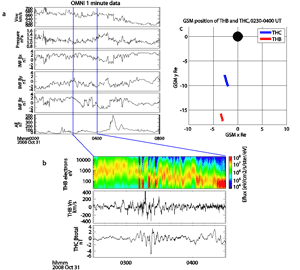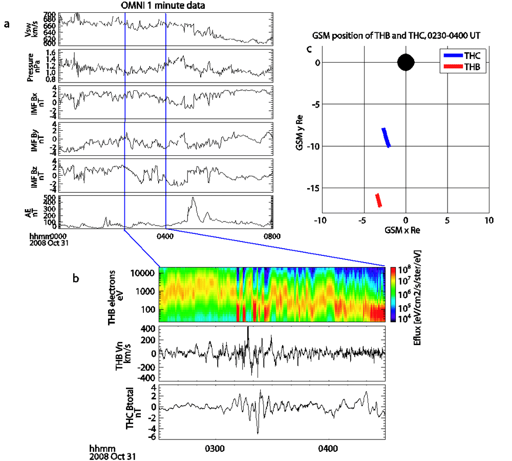 Figure 1. a) From top to bottom, solar wind velocity, dynamic pressure, IMF Bx (GSE/GSM), IMF By (GSM), IMF Bz (GSM), and the AE index from OMNIweb. b) From top to bottom, a dynamic energy flux spectrogram from TH-B (electrons), the plasma velocity component normal to the magnetopause inferred from TH-B ESA ion measurements, and detrended total magnetic field from TH-C. c) The orbits of TH-B and TH-C in the GSM equatorial plane during the interval from 0230 to 0400 UT. |