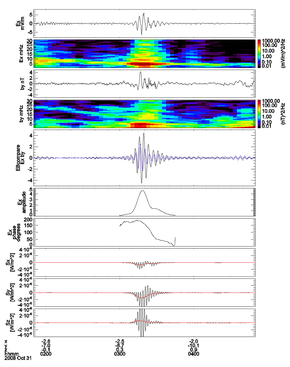 Figure 2. From top to bottom, radial electric field, radial electric field dynamic power spectra, east-west magnetic field, east-west magnetic field spectra, band pass filtered (3-6 mHz) radial electric (black) and east-west magnetic field (blue) data, instantaneous amplitude of radial electric field, instantaneous phase of radial electric field, radial Poynting vector (black) and time averaged radial Poynting vector (red), east-west Poynting vector, field-aligned Poynting vector. The time average is computed with a running 10 minute boxcar window. |