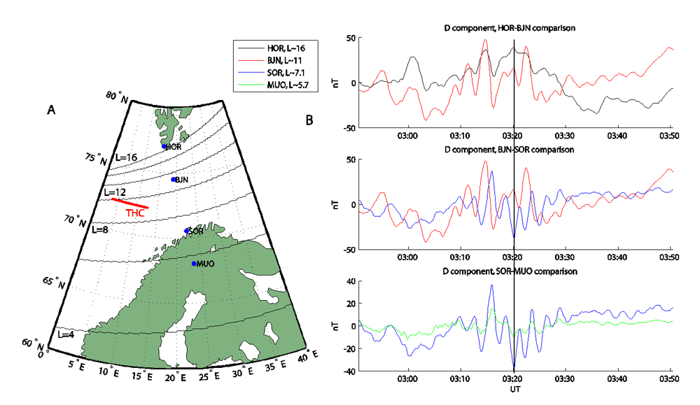 Figure 3. a) The positions of IMAGE magnetometer stations are plotted on a geographic grid (dotted lines) and solid black lines of constant McIlwain L parameter are overplotted in steps of 2 Re. The red line is the ground track of TH-C, mapped from TH-C's position using field line tracing in the Mead and Fairfield magnetic field model. b) In each panel, the H component of the magnetic field with hourly means subtracted is plotted for pairs of stations. From top to bottom, the H component of the magnetic field observed at HOR and BJN, BJN and SOR, and SOR and MUO is shown. A black line indicates a time when a 180 degree phase difference between BJN and SOR is particularly clear, whereas the other stations are in phase. |