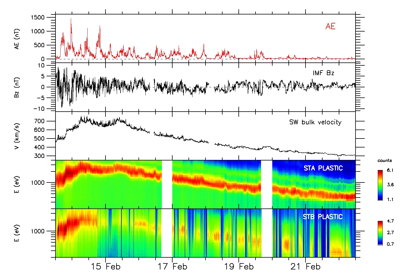 Figure 1. From top to bottom, the variation of the AE index, of the Bz component of the Interplanetary Magnetic Field (IMF) and of the solar wind velocity. The fourth and fifth panels show the energy spectrograms of protons measured in solar wind onboard STEREO-A and similar measurements performed onboard STEREO-B on its travel away from the Moon. |