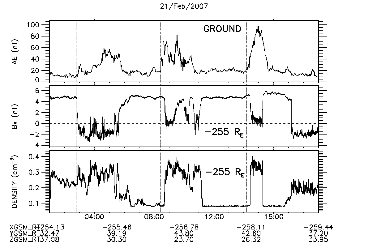 Figure 2 provides a comparison between the variation of the electric current flowing in the Earth's ionosphere (AE) with the changes of the magnetic field and the plasma density recorded at 255 RE from the Earth's in the distant tail of the magnetosphere. Three main AE increases are detected, around 03:40, 08:30 and 14:10 UT. During major disturbances, the ionospheric current can be 10 times higher, so these changes are particularly weak. The modifications of the far tail are slightly delayed in time with respect to the ionospheric events. The duration of the far tail perturbations is almost the same as that of the electrojet enhancements. During high-density episodes the satellite is outside the magnetosphere (inside the magnetosheath), in flowing solar plasma, while during low-density periods, the satellite is located inside the magnetosphere.