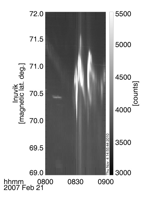 Figure 3. Keogram (magnetic latitude-time) giving the latitudinal variation of the auroral luminosity recorded at INUVIK. These "white light" data are from THEMIS ground based observatories. A narrow band of auroral luminosity is drifting equatorward from 0800 to 0828 UT on 21 February 2007 during the growth phase of the substorm. At 0828 UT the aurora breaks up. |