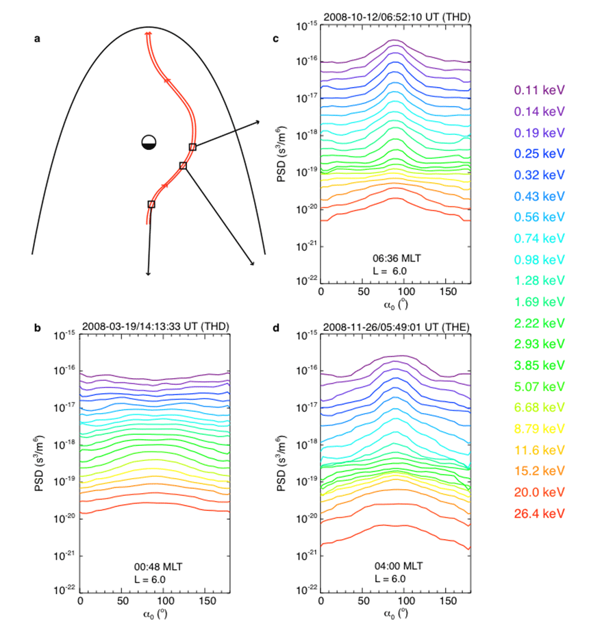 Figure 1. (a) A schematic plot showing drift paths (red lines) of plasma sheet electrons injected into the inner magnetosphere. Squares show the rough locations where measurements in panels b, c,and d were taken. Representative electron phase space densities at different energies (represented by different colors) calculate