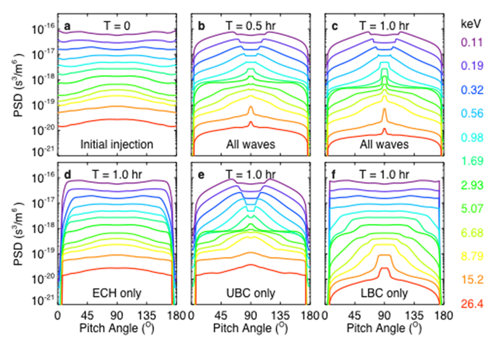 Figure 2. (a) Initial distribution of electrons following an injection and the evolution of electron distribution after interactions with the combination of ECH waves, upper band chorus, and lower band chorus for (b) 0.5 h and (c) 1 h. To demonstrate the effect of each kind of waves on the electron distribution, we show the distribution of electrons after interactions for 1.0 h with (d) ECH waves only, (e) upper band chorus only, and (f) lower band chorus only. |