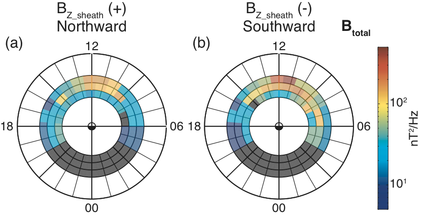 Figure 2 shows distribution of spectral energy density (ε) as a function of MLT under conditions of (a) positive (northward pointing) and (b) negative (southward pointing) BZ_sheath. Moving outward from the center of the polar plots the three concentric circular grids correspond to the BL, MP and SH regions, respectively. These plots show that the largest ε irrespective of the orientation of BZ_sheath is observed near noon and peaks in the SH just outside the MP with a distribution that favors the pre-noon hours. However at MLTs more than 2 hours either side of the noon we find ε peaks at the MP and is an order of magnitude larger on the dawn (4 - 12 MLT) than duskside (12 - 20 MLT). Integrating over the entire spatial range surveyed shows that ε is larger for BZ_sheath negative than BZ_sheath positive.