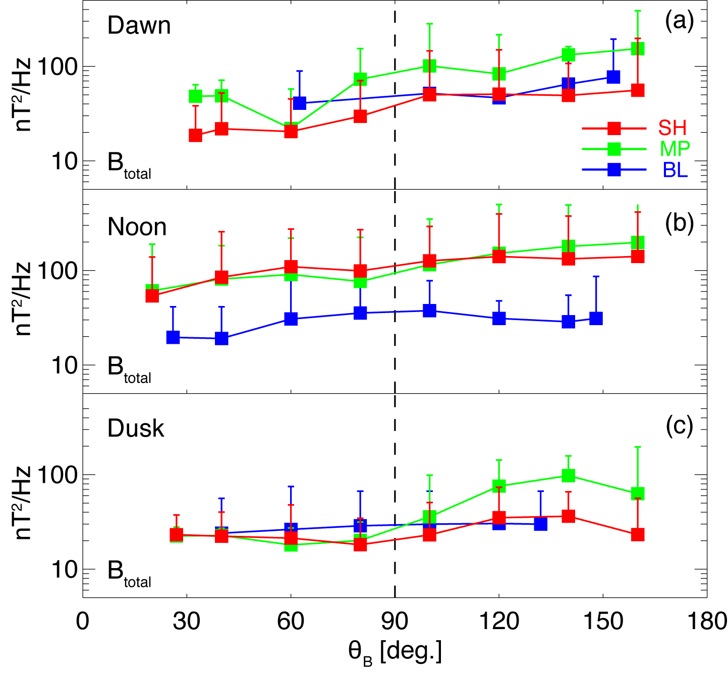 Figure 3. Variation of power spectral density of total magnetic field as a function of magnetic shear angle (θB). Panels from top to bottom referring to different magnetic local time sectors, dawn, noon and dusk, respectively. In each panel, blue, green and red lines corresponding to the relationship in BL, MP and SH, respectively. Since logarithmic y-axis, error bars are plotted just in upper direction. |