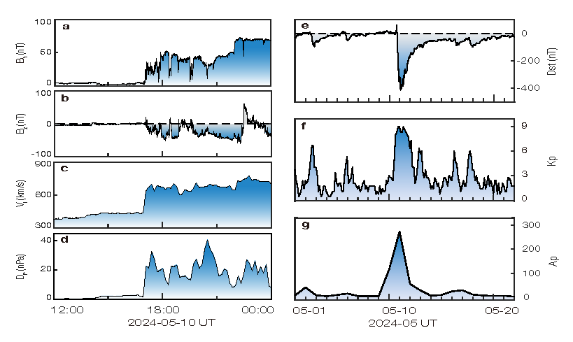 At 17:00 on May 10, 2024, the THEMIS B spacecraft, located upstream of Earth at [48.6, 35.5, 5.1] RE, observed a dramatic change in solar wind conditions (Figures 1a-1d). This unusually strong interplanetary ejecta quickly hit the Earth, triggering a series of severe and enduring geomagnetic storms. In the following hours, the Dst index plummeted to -412 nT (Figure 1e). Simultaneously, the Kp index rapidly reached its maximum of 9 (Figure 1f) and the daily resolution Ap index experienced a sharp increase, peaking at 274 (Figure 1g).