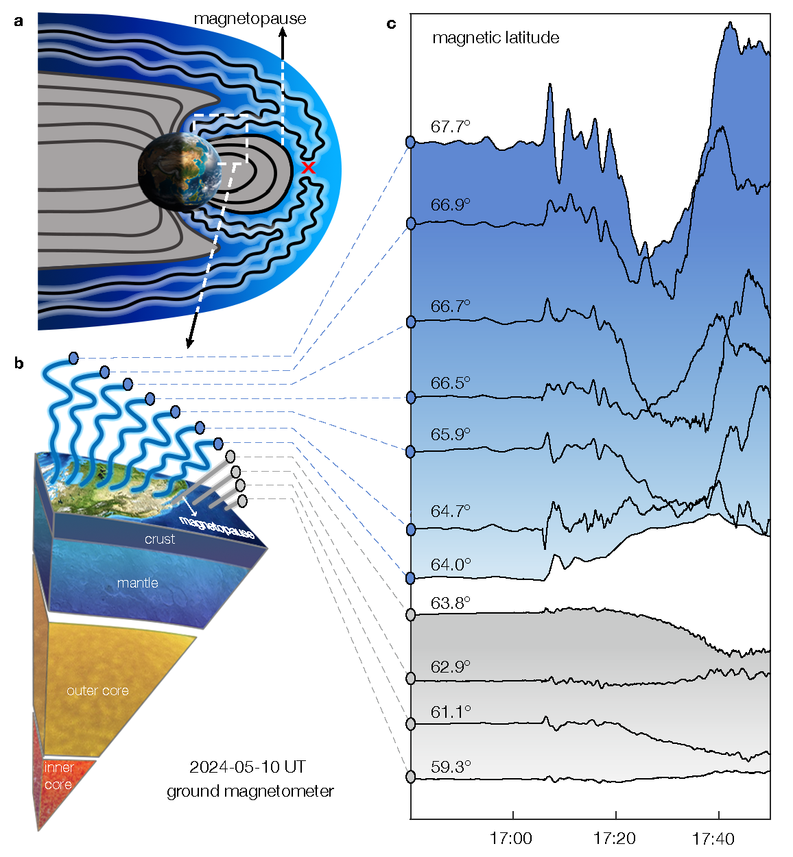 On 10 May 2024, a super space storm—characterized by the Dst index plummeting to -412 nT and induced by a strong coronal mass ejection on the Sun—attacked the Earth’s magnetosphere. This geomagnetic storm, according to the human record of Dst index, is the third-strongest one throughout history (only slightly lower than the Quebec event in 1989 and the Halloween storm in 2003). Under such an extreme condition, many satellites were directly exposed to solar ejections, leading to significant degradations in GPS and radio communications, and even caused a sharp orbital decline of the International Space Station. However, how the magnetopause evolves and reforms remains unclear, because only few spacecraft measurements were available in the dayside magnetosphere during previous events. Here, by utilizing THEMIS ground magnetometers array together with in-situ measurements of multiple spacecraft, we for the first time determine the magnetopause standoff distance during such superstorm.
