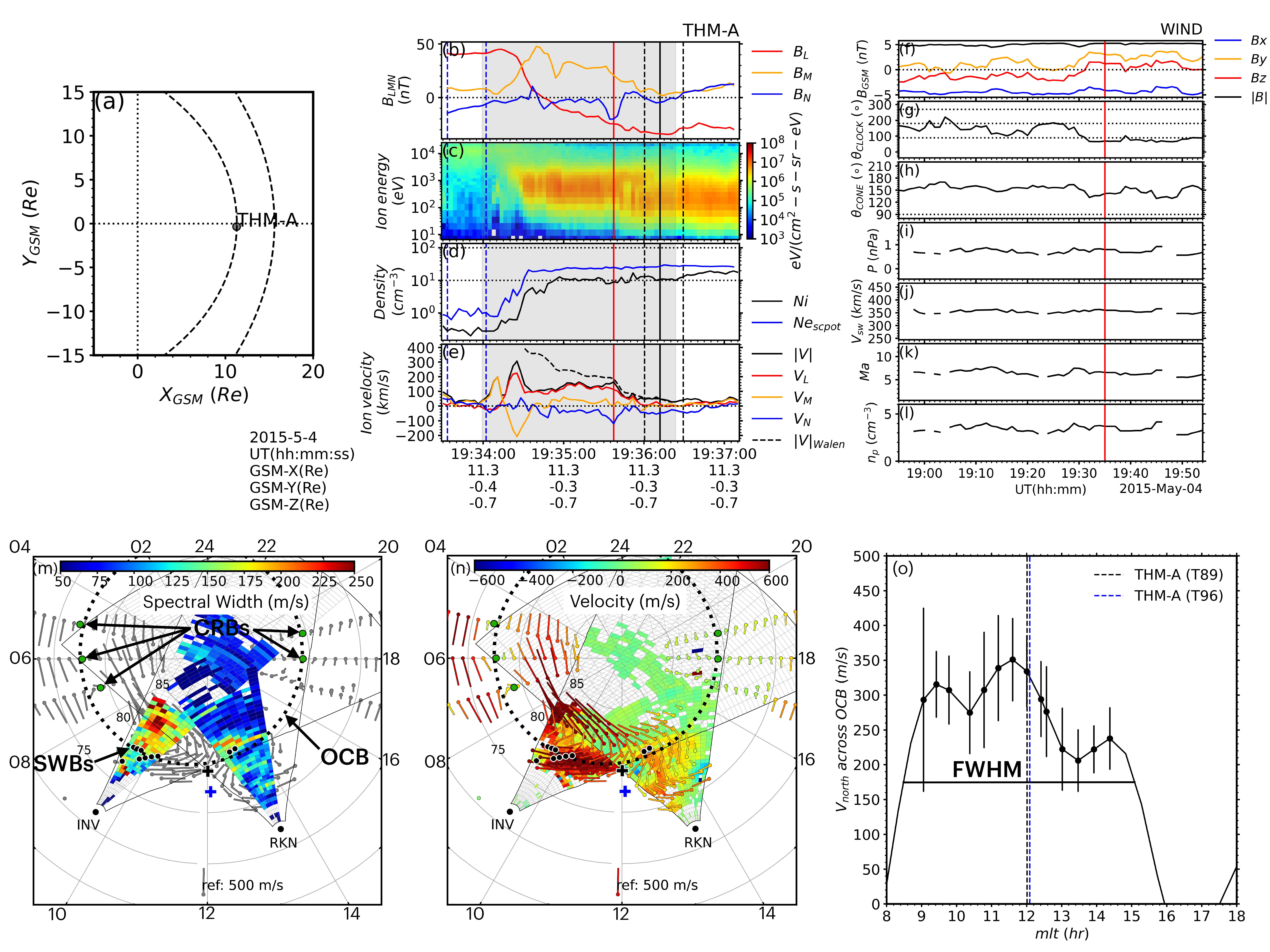 Figure 1. Overview of a case study on 4 May 2015. (a) Location of THEMIS-A relative to model magnetopause and bow shock. (b)–(e) Magnetic field, ion energy, density, and ion bulk speed from THEMIS-A. (f)–(l) Solar wind parameters: IMF, clock angle, cone angle, pressure, speed, Mach number, and density from WIND. (m)–(n) SuperDARN observations of the Spectral Width Boundary (SWB) and Line-of-Sight Velocity. Vectors show fitted velocity. ‘Plus’ markers show the magnetic footprints of satellites under T89 (black) and T96 (blue). (o) Longitudinal profile of antisunward flow just inside the OCB. |