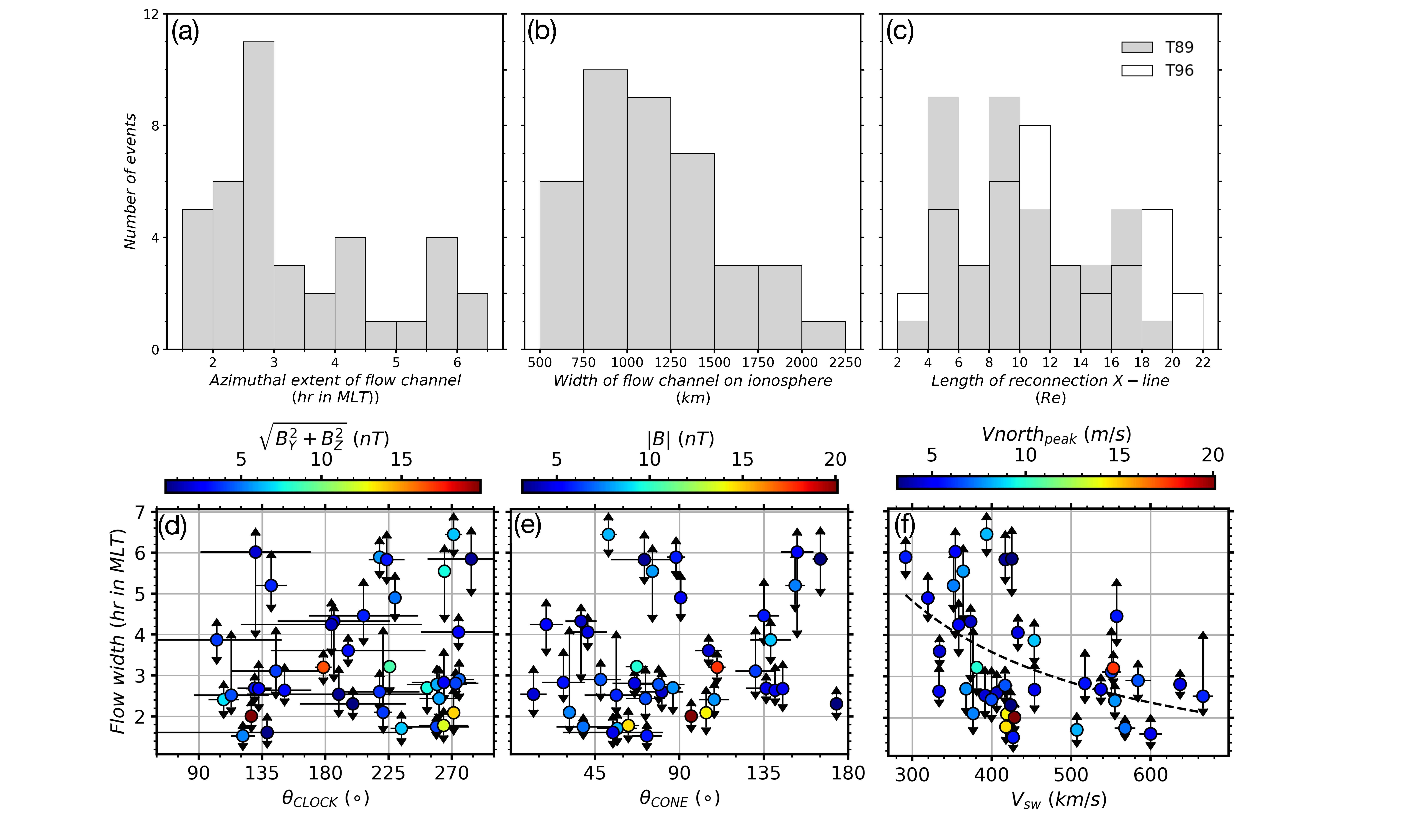 To investigate the spatial extent of the X-line and possible control factors, we performed a statistical study of 39 events with clear space–ground observations of reconnection. The events were collected after surveying 3 years (2015–2017 inclusive) of dayside magnetopause crossings by THEMIS A, D, and E. We observed a wide variability in the azimuthal extent of X-lines, ranging from ~1.5 hr MLT to ~6.5 hr MLT (Figure 2a). The widths of the flow channels ranged from ~600 km to ~2200 km in the ionosphere (Figure 2b). The corresponding lengths of the X-line ranged from ~3 RE to ~22 RE (Figure 2c). Figure 3 shows the flow width plotted against solar wind parameters, namely, clock angle, cone angle, and bulk speed. The clock angle is the angle between the IMF projection on the vertical plane and the vertical line. The cone angle is the angle between the IMF and the Sun–Earth line. No clear dependence on IMF orientation was observed. Nevertheless, the flow widths are comparatively narrow (~2 hr MLT) for events with strongly dawnward or duskward IMF (Figure 2d). We saw a negative association of the flow widths with the solar wind speed. The majority of the spatially extended events are found during lower solar wind speed conditions, whereas the flow channels were mostly spatially limited during higher solar wind speeds (Figure 2f).