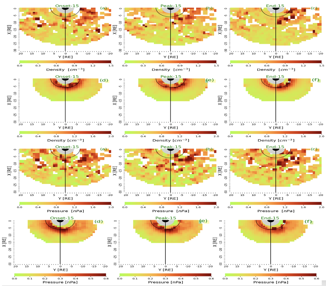 | Figure 2. Top panels (a-f): These panels present the average ion number density within Earth’s plasma sheet during various substorm phases (Onset-15, Peak-15, End-15), as observed by the MMS-1 (a-c) and THEMIS-A, D, E (d-f) (2016-2020). The squares in the grid represent a region of 1 RE by 1 RE . Bottom panels (a-f): Similar to the top panels, these panels show the average ion pressure in the different substorm phases observed by the MMS-1 (a-c) and THEMIS-A, D, E (d-f). |