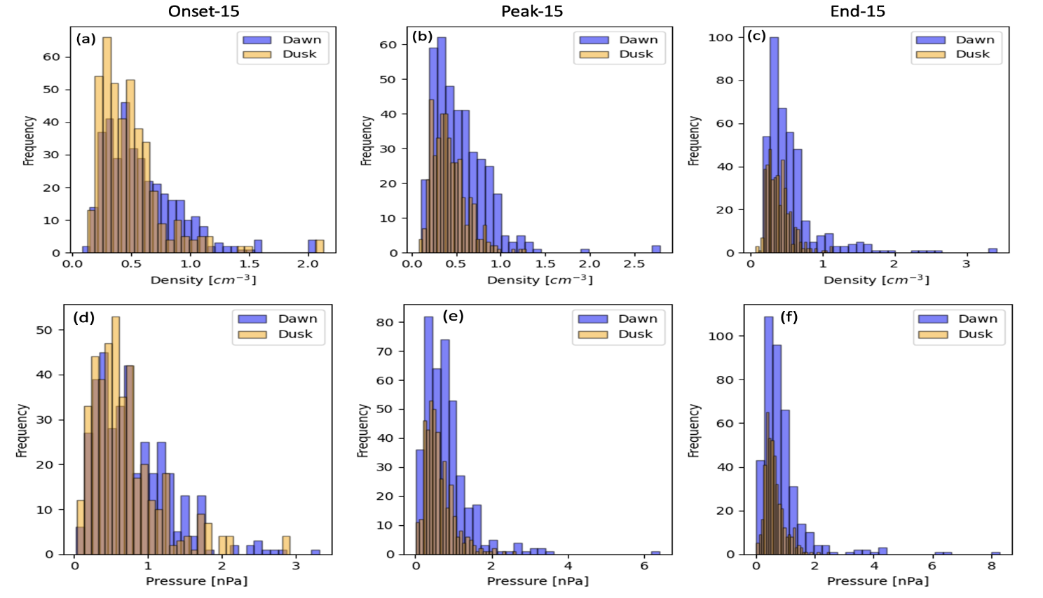 | Figure 3. A series of histograms show the occurrence of V⊥x values on the dawn and dusk sides for density (a–c) and pressure (d–f) during Onset−15, Peak−15, and End−15, using MMD data. These histograms illustrate the variations in these parameters between the two regions, highlighting potential differences in their distributions. |