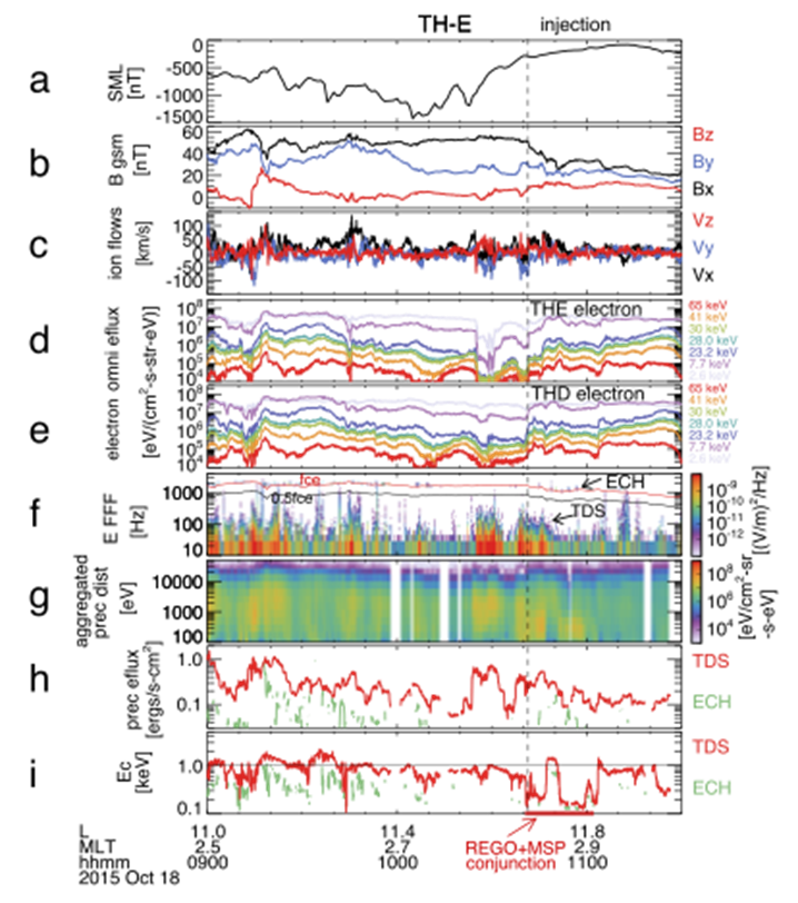This is a substorm‐like event that occurred between ~07:00–11:30 UT on 18 October 2015, during a moderate geomagnetic storm as Dst descended to − 56 nT. During the recovery phase near 10:40 UT, the THEMIS‐E spacecraft, positioned in the tail‐to‐dipole transition region with L ∼ 11.8 and MLT ∼ 2.9 hr, observed an electron injection with energy flux enhancements across a broad range of energies up to ∼200 keV, along with weak but noticeable earthward ion flows with Vx exceeding 80 km/s (Figures 1b–1e). Figure 1f shows that broadband electrostatic fluctuations persisted below ∼1 kHz, electron cyclotron harmonic (ECH) waves above fce were intermittent around the injection, and no whistler‐mode waves were detected throughout the event. Although high‐cadence waveform data were unavailable during 10:00–11:30 UT, those available around the injection event near 09:00‐09:20 UT revealed that these electrostatic broadband fluctuations consisted of TDSs at frequencies above ∼50 Hz. Using in‐situ plasma and field measurements, we calculate the bounce‐averaged diffusion coefficients Dαα for TDSs and ECH waves (Shen et al., 2024). These time‐varying Dαα, combined with measured equatorial electron energy fluxes near the loss cone, are used to estimate the aggregate and constituent precipitating electron distributions within the loss cone resulting from electron scattering by combined and individual wave effects (Figures 1g and 1h). Precipitating fluxes driven by TDS activities persisted throughout the event and were generally stronger than those driven by ECH waves, which were more intermittent and bursty and exhibited weaker amplitudes.