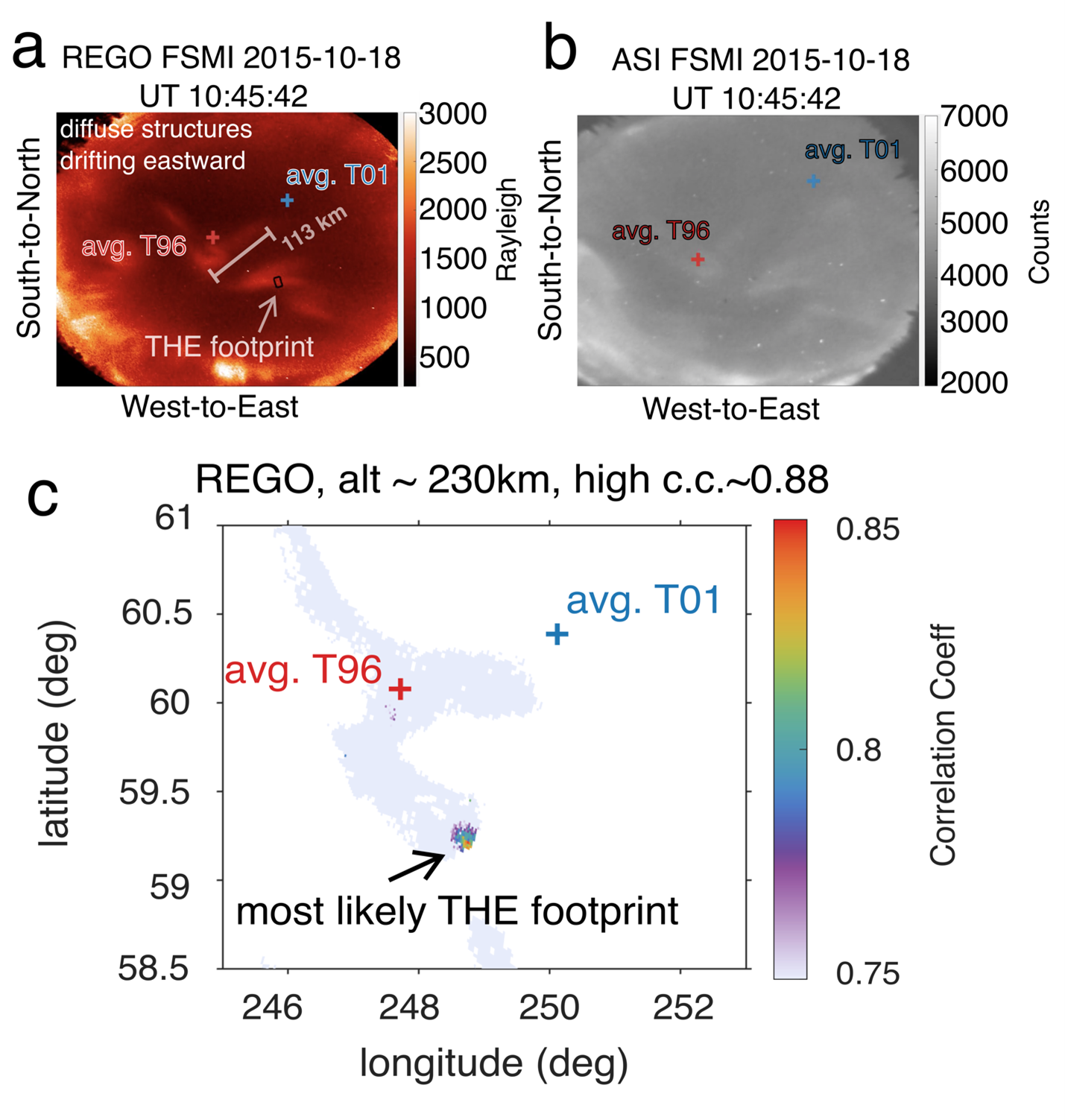Figure 2. (a) Example REGO red‐line auroral image showing streamer‐like diffuse auroral structures with horizontal spatial scales of up to ∼100 km drifting eastward and equatorward, recorded at 10:45:42 UT. (b) Example ASI whitelight auroral image corresponding to the red‐line image. The streamer‐like structures are less clear, blended into the diffuse auroral background. (c) Cross‐correlation coefficients between red‐line auroral intensities measured by the REGO 2D imager and TDS‐ driven precipitating electron energy fluxes estimated from THEMIS‐E. The maximum correlation reached ∼0.88 around the geographic latitude of 59.1° and longitude of 248.9°, which we interpret as the most likely THEMIS‐E footprint during the 20‐ min interval from 10:44–11:04 UT. The average footprints of THEMIS‐E predicted by the T01 and T96 models are also indicated by the plus symbol. |