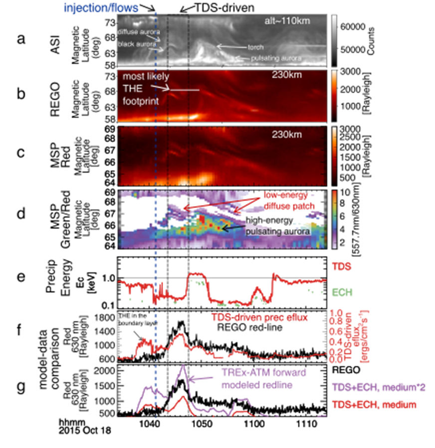 Figure 3. (a) THEMIS ASI auroral keogram. (b) REGO red‐line auroral keogram. (c) MSP red‐line emission keogram. (d) MSP green‐to‐red (557.7‐to‐630 nm) emission ratio keogram. (e) Precipitating electron characteristic energies, same as that in Figure 1m. (f) Comparison between REGO red‐line auroral intensities (black) measured at the most likely THEMIS‐E footprint and TDS‐driven precipitating energy fluxes (red). (g) Comparison between REGO red‐line auroral intensities (black) and TREx‐ATM forward modeled auroral red‐line intensities. The red and magenta lines represent forward‐modeled intensities resulting from the combined effects of TDS and ECH waves, using equatorial median flux levels and twice the median flux levels, respectively. |